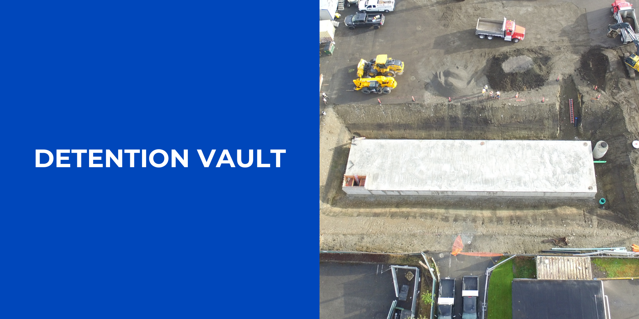 Detention Vault: A detention vault is a storage facility constructed with reinforced concrete. It’s used to manage stormwater quantity flowing to nearby surface waters and helps prevent flooding and erosion in rivers and streams.