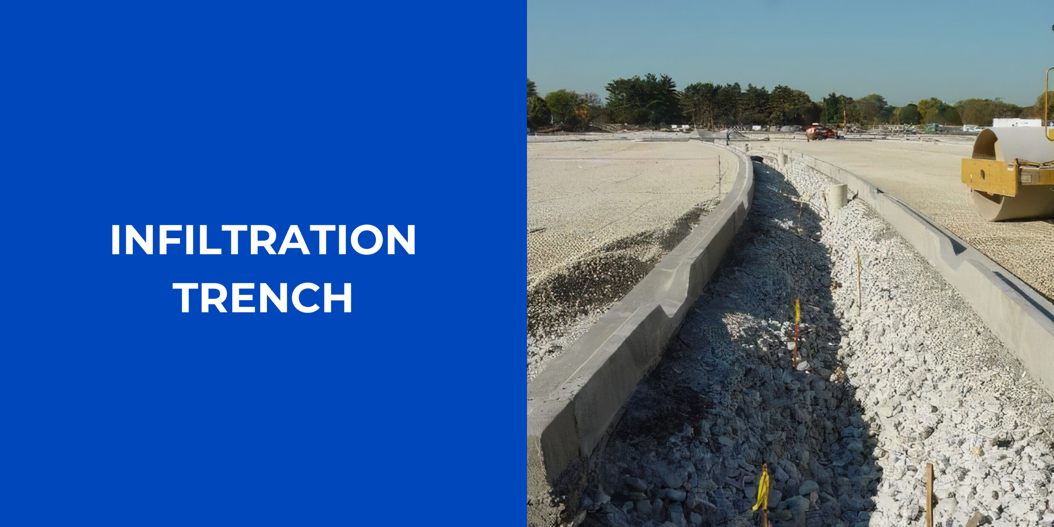 Infiltration Trench: A shallow, excavated trench filled with gravel or crushed stone that captures and infiltrates stormwater runoff. It allows water to percolate into the ground, reducing surface runoff and recharging groundwater.
