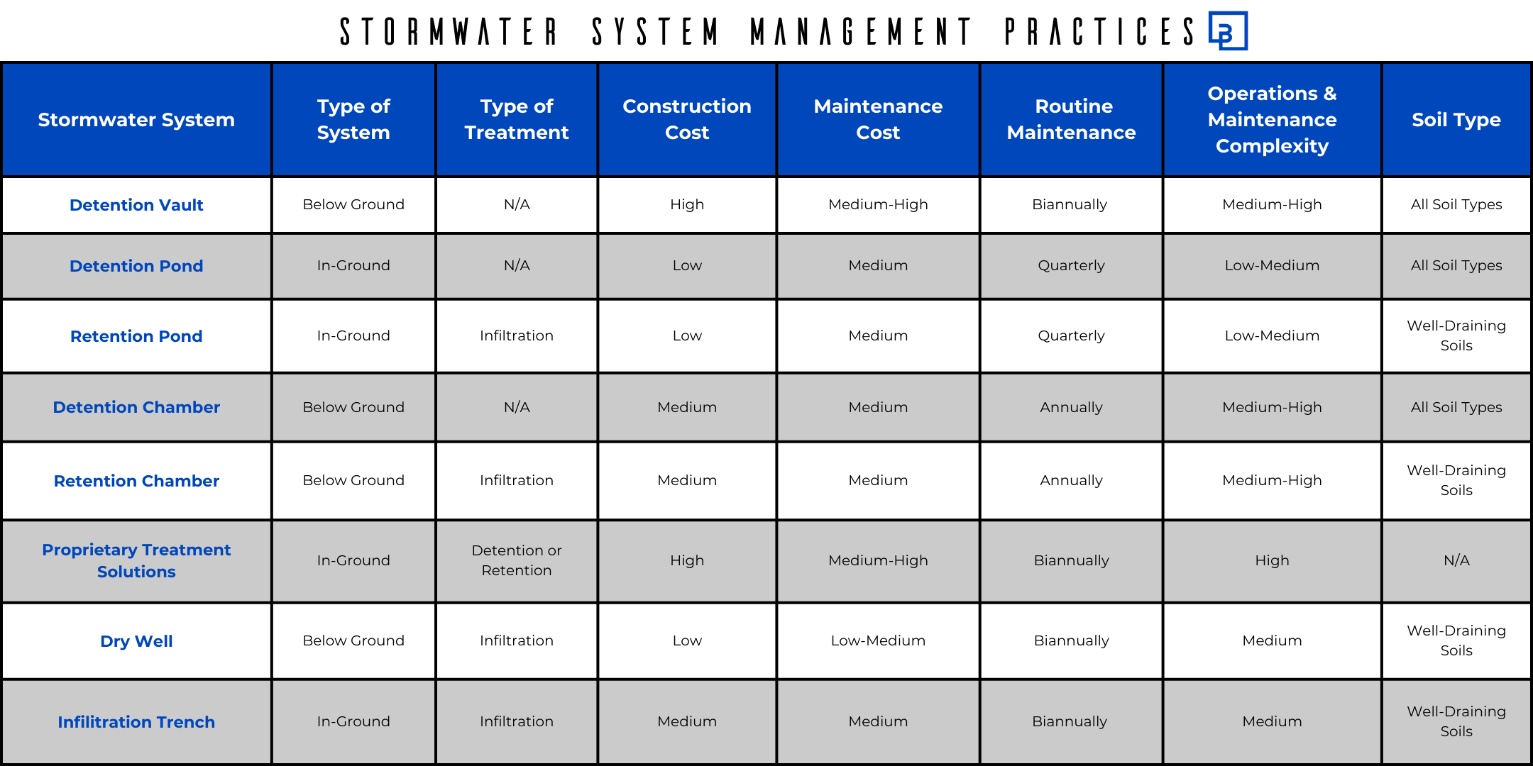 The chart below provides a comparison of various stormwater management practices. It highlights key factors to consider when deciding the best stormwater management system for development. These include type of treatment, construction costs, maintenance costs, routine maintenance, operations and maintenance complexity, and soil type. These systems are evaluated based on each site, and the stormwater management goals that are required for development. This visual guide will serve as a great resource to offer a basic understanding of what each stormwater system accomplishes in site development.