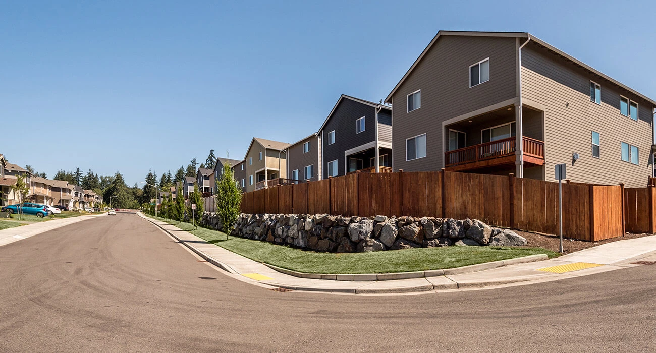 - Steep grades which required a unique grading design, including a combination of daylight basement lots that were designed along with tiered retaining walls to meet the site constraints.
