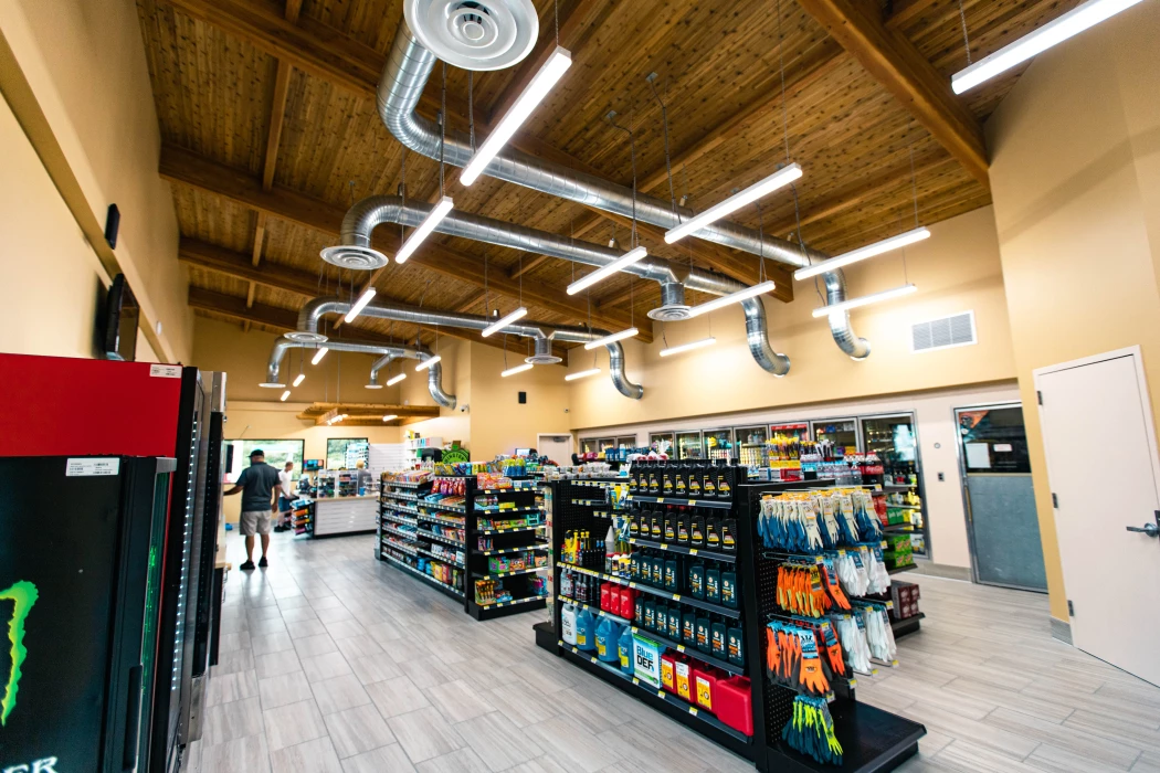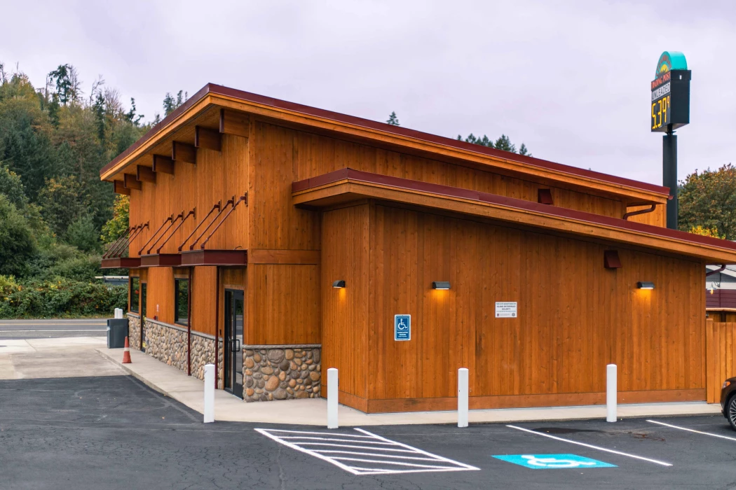 The Steamboat Trading Post is a tribal convenience store and gas station in Olympia, WA. Our team partnered with the owner’s representative, Island Enterprises, Inc. to provide architectural design services for the remodel and expansion of the existing store and fueling islands. The aesthetics of the building were completely changed, converting the exterior appearance from CMU to wood, creating taller walls and adding a sloped metal roof with exposed glu-lam beams. New canopies over the windows were a key element of the new design. All interior finishes were updated along with new cabinetry and counters. New canopy roof structures were installed over the fueling islands. Our architects were responsible for the design and documentation for the expansion and remodel along with consulting partners who provided structural, mechanical, electrical and plumbing design.